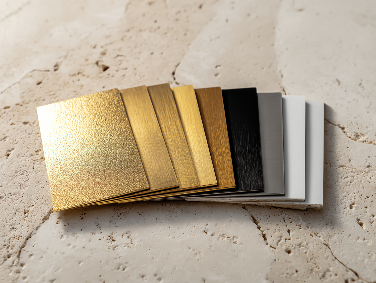 Après ponçage et polissage multi-passes, chaque pièce est brossée dans un grain unique, puis traitée (PVD, laques techniques ou polissage miroir). Contrôle couleur sous lumière neutre (≈5200 K) pour une teinte fidèle (doré brossé, gunmetal, nickel…).